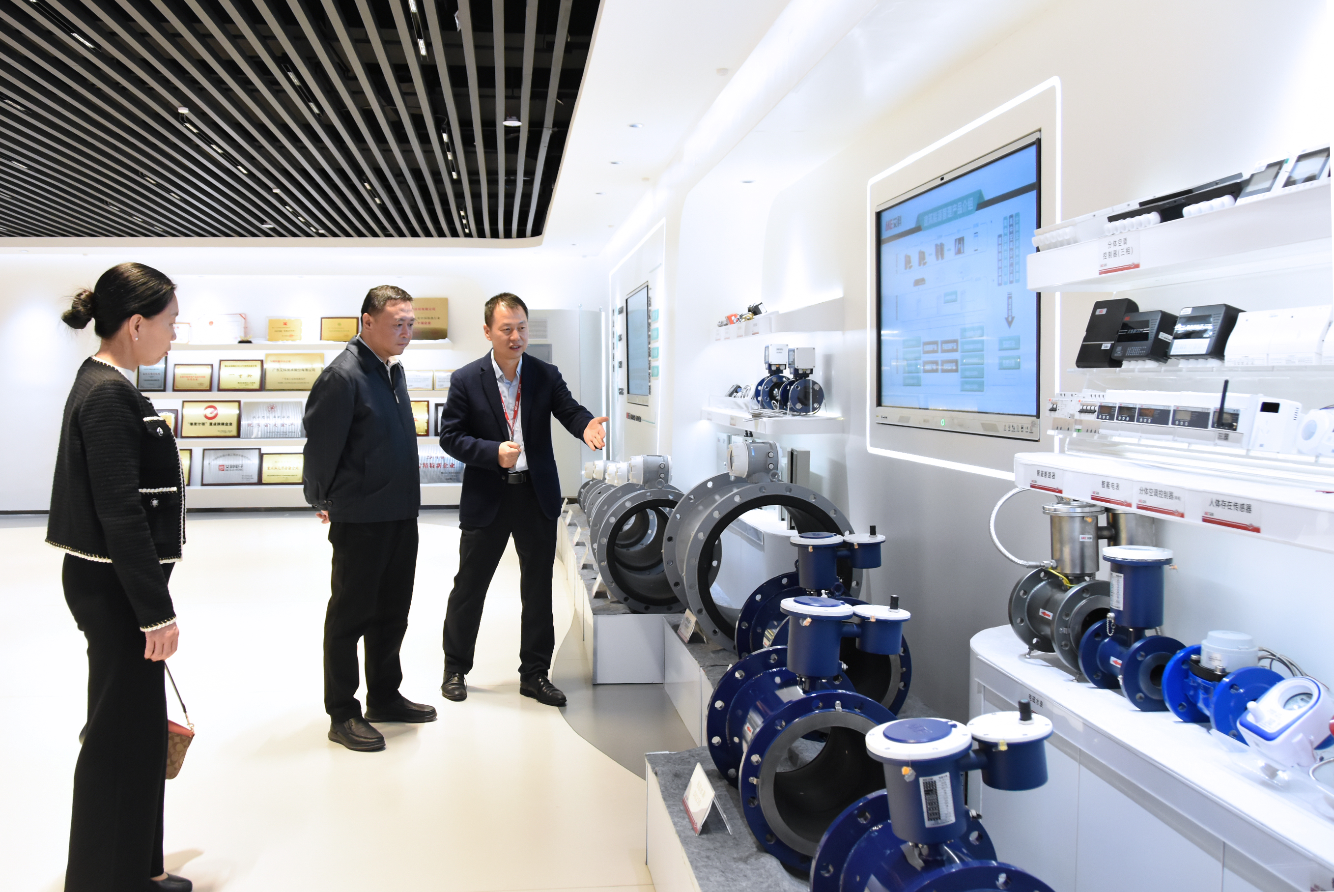 在艾科产品体验中心,公司总经理张江民重点介绍了艾科发展历程、业务板块布局等发展情况,随后进一步参观了艾科0.2级电磁流量计、一级电磁热量表、智能电表、电磁水表等核心硬件产品的优势性能、创新功能,特别介绍了艾科近年来协助中信环境技术建设的的潮南园区平台、集团级智慧水务管理平台情况以及为各区域公司提供智能仪表和自控系统改造服务情况。通过展示与交流,赵翔对艾科在智能仪表自控方面的产品创新能力和丰富经验给予了充分认可。