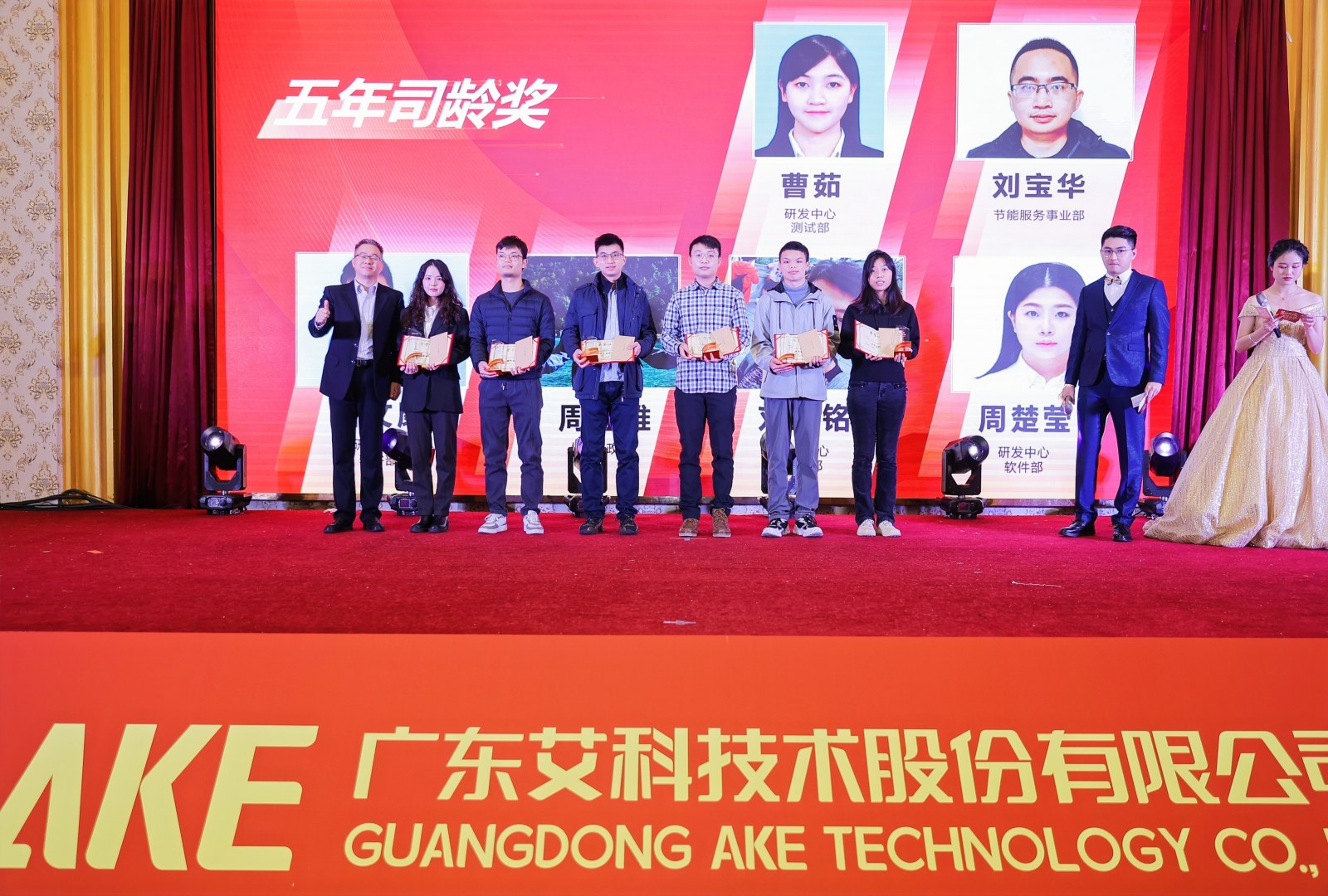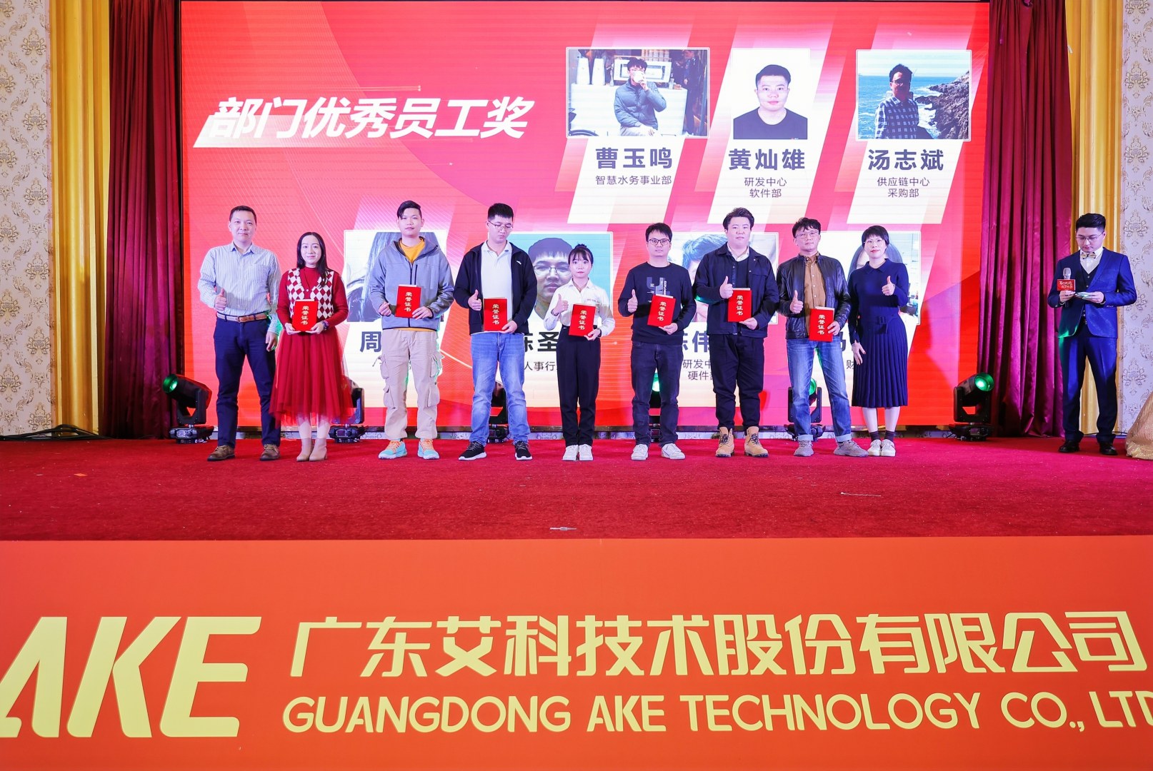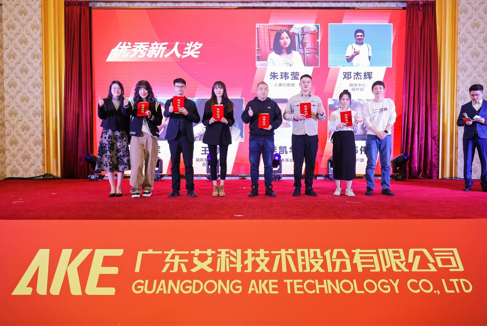 会上,艾科对过去一年工作表现优异的员工进行表彰颁奖。经过层层选拔,十五位同事脱颖而出,其中六位荣获“优秀新人奖”、七位荣获“部门优秀员工奖”和两位荣获“公司级优秀员工奖”。无论是优秀新人还是优秀员工,他们都拥有专业的职业素养和坚定的责任使命感,能出色地完成各项工作任务,是各位员工中的标杆典范。