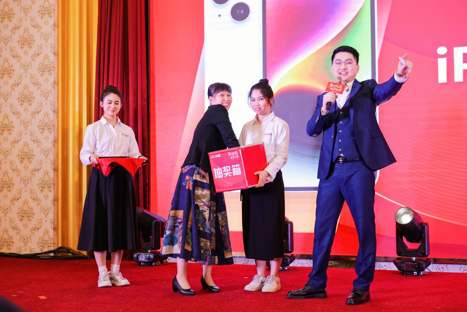 晚会穿插一轮轮抽奖环节,惊喜一浪接一浪,苏泊尔台式饮水机、徕芬智能温控养发吹风筒礼盒、倍轻松肩颈按摩器按摩仪艾灸礼盒、追觅智能家用全自动扫拖地吸尘三合一全能扫地机、iphone 14手机,大家都期待幸运光顾。临时追加的现金奖环节,令现场气氛推至高潮。