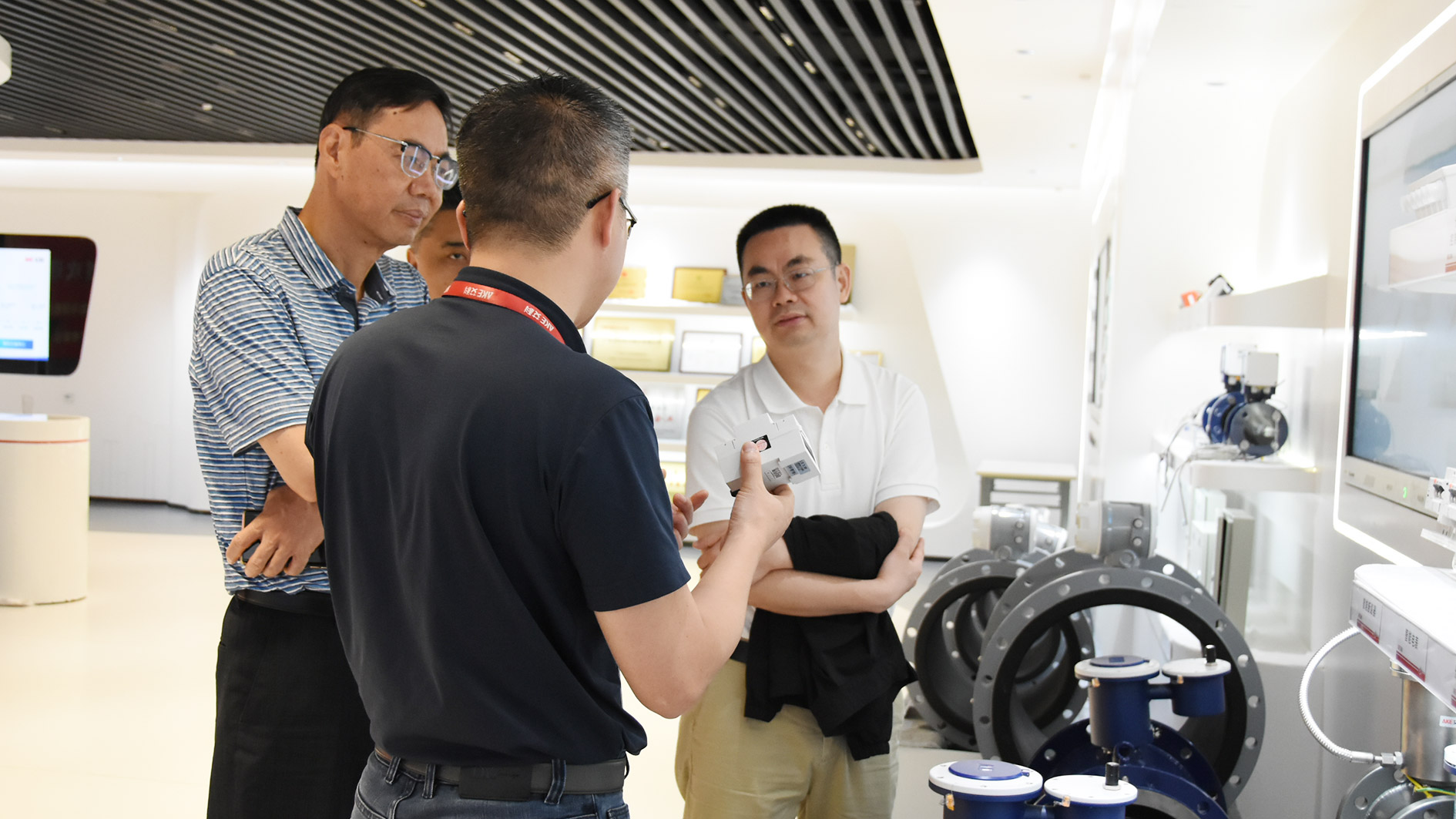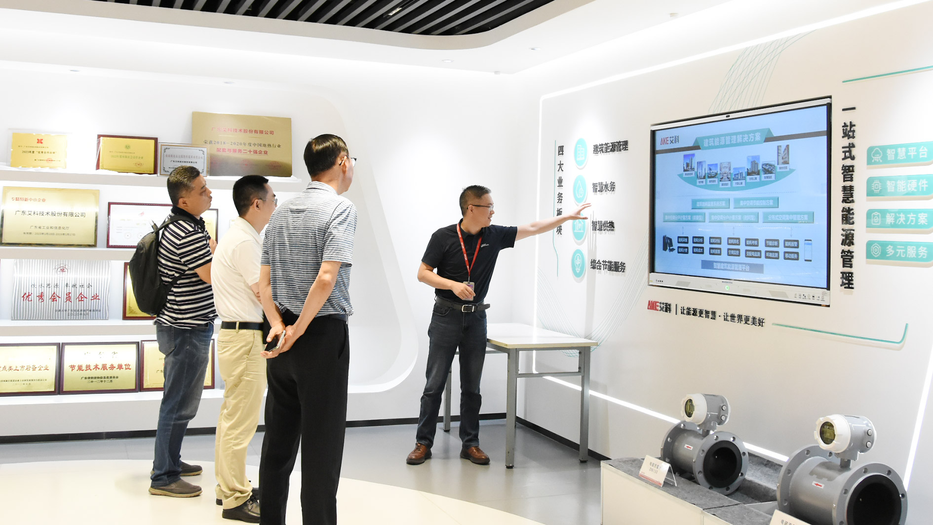 在艾科产品体验中心,艾科副总经理李飞龙全面介绍了公司的发展历程、业务布局,现场讲解了艾科自主研发的0.2级电磁流量计、1级电磁热量表、风盘控制器等核心硬件产品的优势性能、节能技术创新点以及成果应用案例。