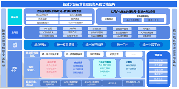 以物联网感知设备为基础,数字化、网络化、可视化、智能化的信息技术设施为支撑,以满足用户需求和水司信息化运营管理为目标,以智能、高效、安全为主要特征,以透彻感知、广泛互联、深度智能为技术特点的现代化水务模式,最终打造成一个漏损可监、水质可控、压阀可调、服务主动、公开透明的全方位共赢智慧水务平台。