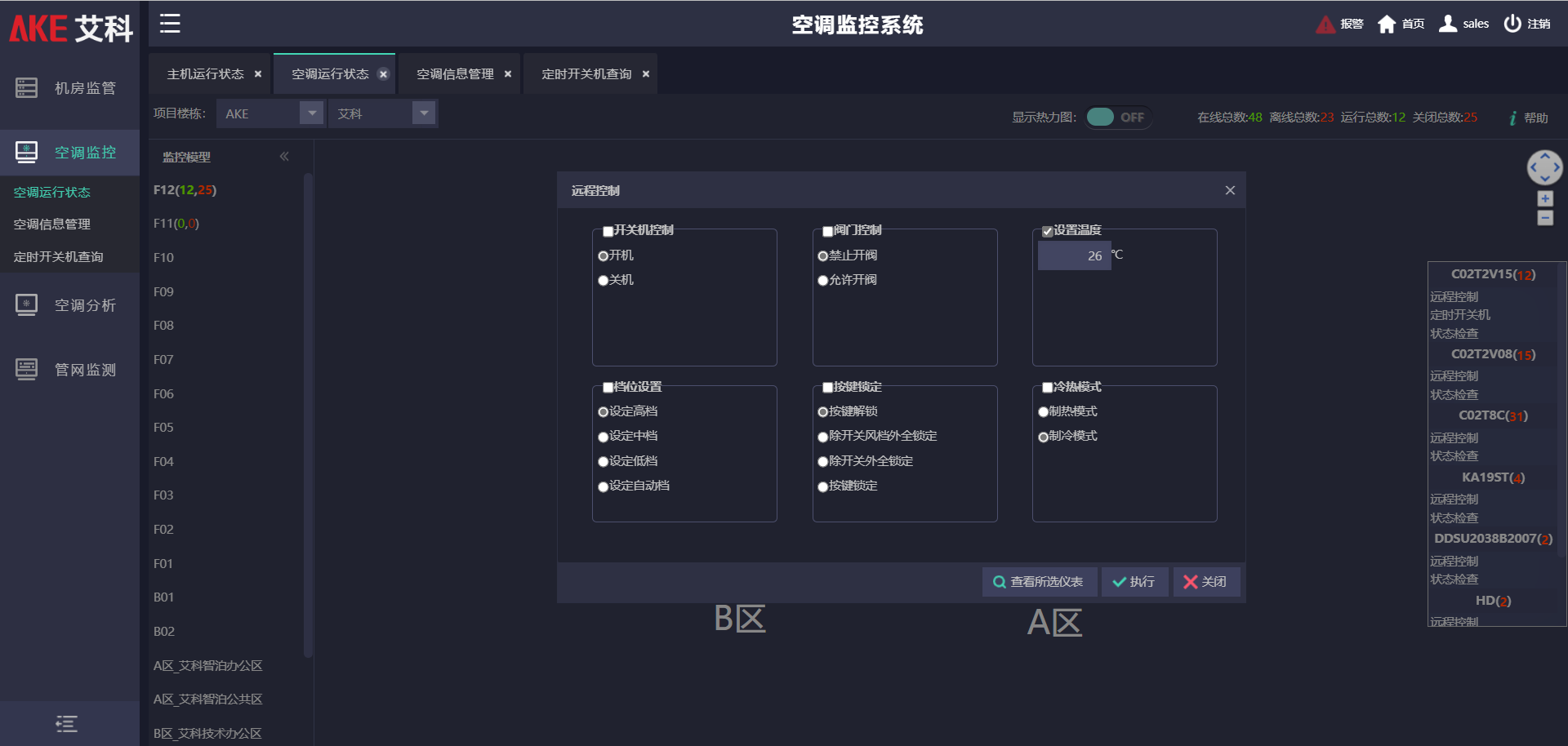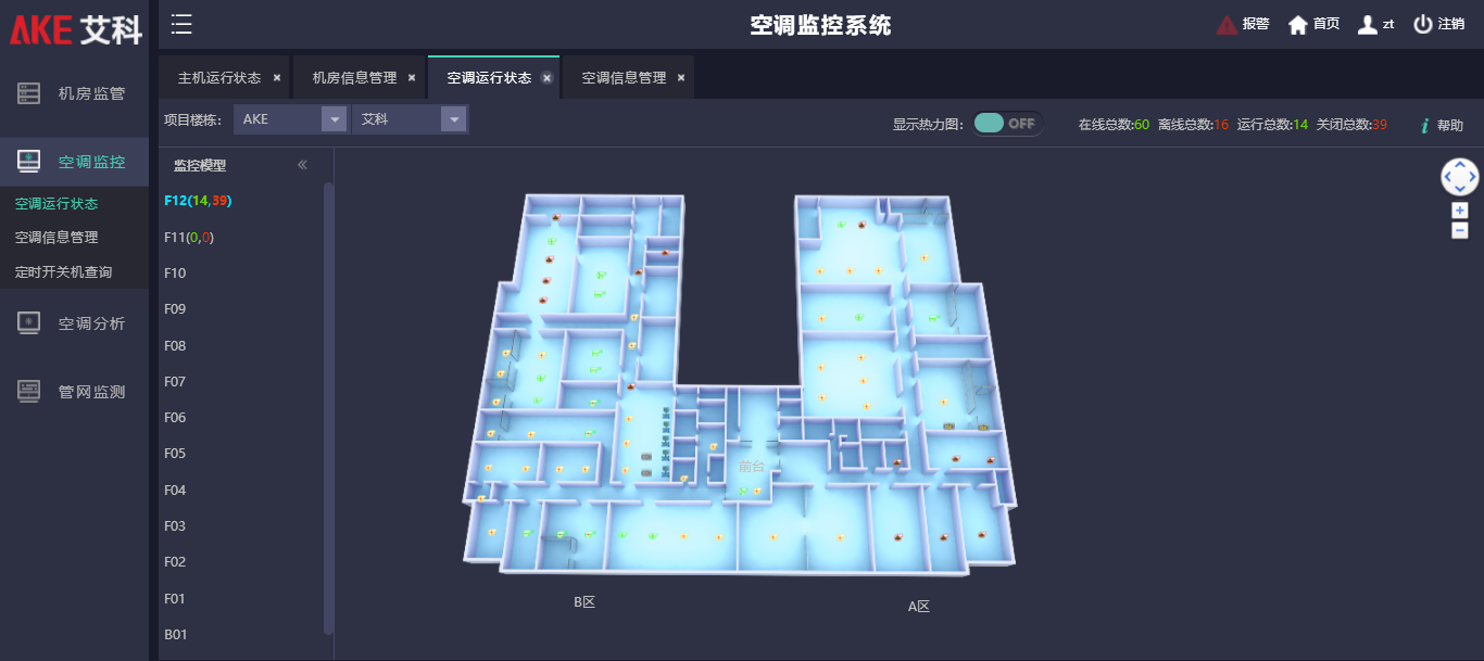 艾科智慧建筑能源管理平台,掌握设备实时连接状态与通讯情况,监测系统末端设备运行情况,可视化设备分布情况,实现末端设备远程统一管理。